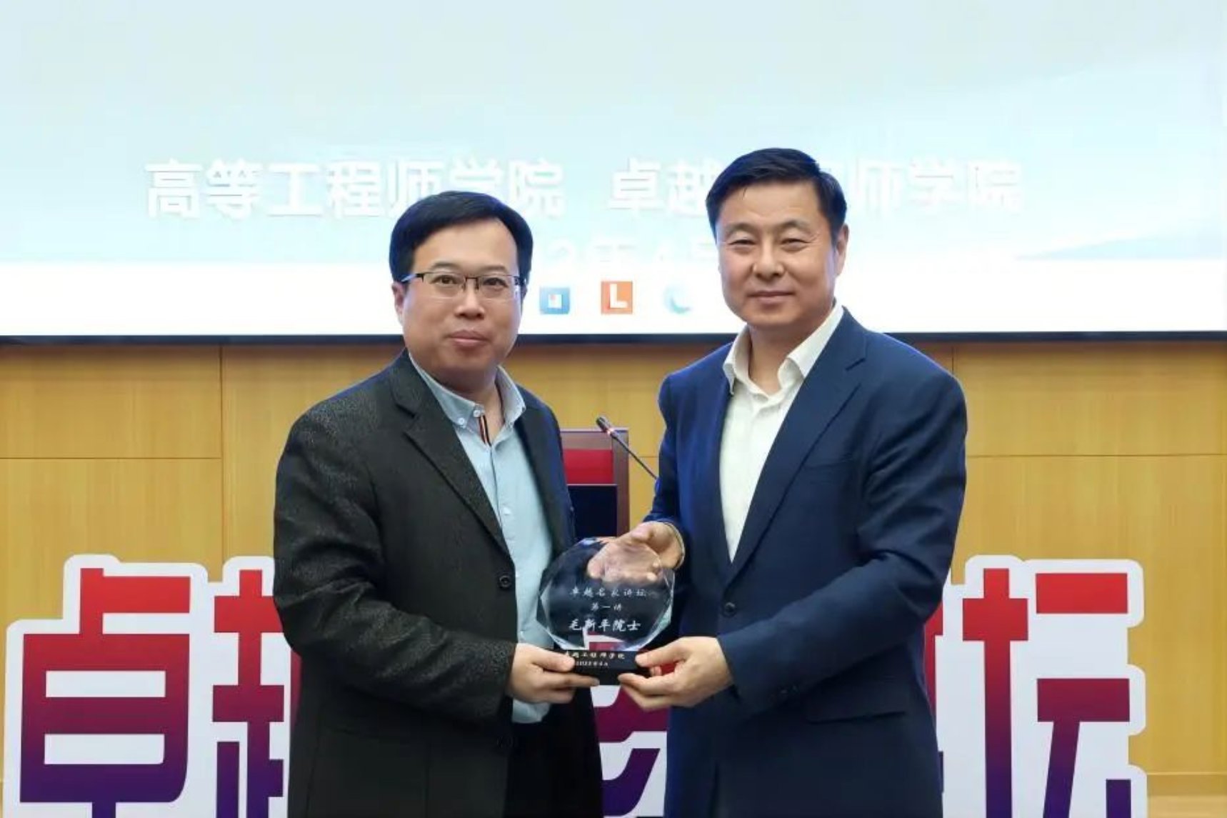 张海君对主讲人毛新平院士进行了详细介绍,并说明了卓越名家讲坛创办情况。苗胜军向毛新平院士赠送卓越名家讲坛纪念牌。