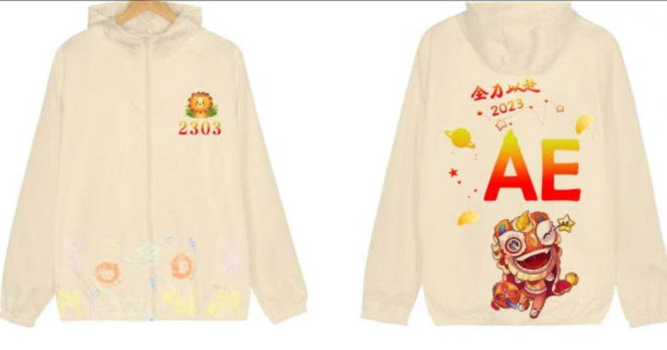 2305班作为本次大赛的冠军,更是设计的独具匠心。以米白色为班服主色,正面班徽主体为一只蓬松可爱的小狮子,背面是的爱心由沙导、小班和班级每位同学的卡通形象组成,这象征着五班同学在沙导和小班的带领下,将心凝聚在一起,聚是一颗心,散是满天星。