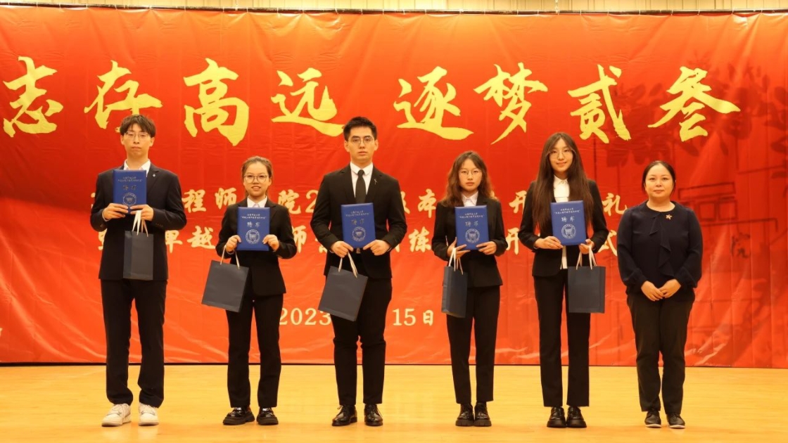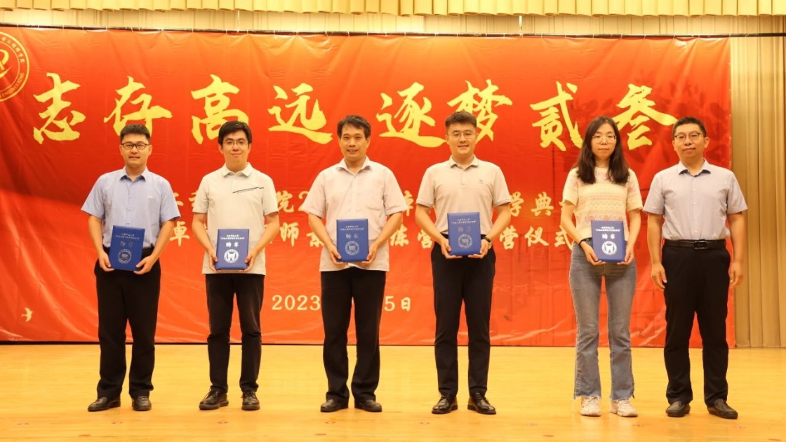 班导师聘任仪式。刘金龙副院长为2023级班导师们颁发聘书,新生各班代表向教师们献花致敬。五位班导师在现场发表新生入学寄语。