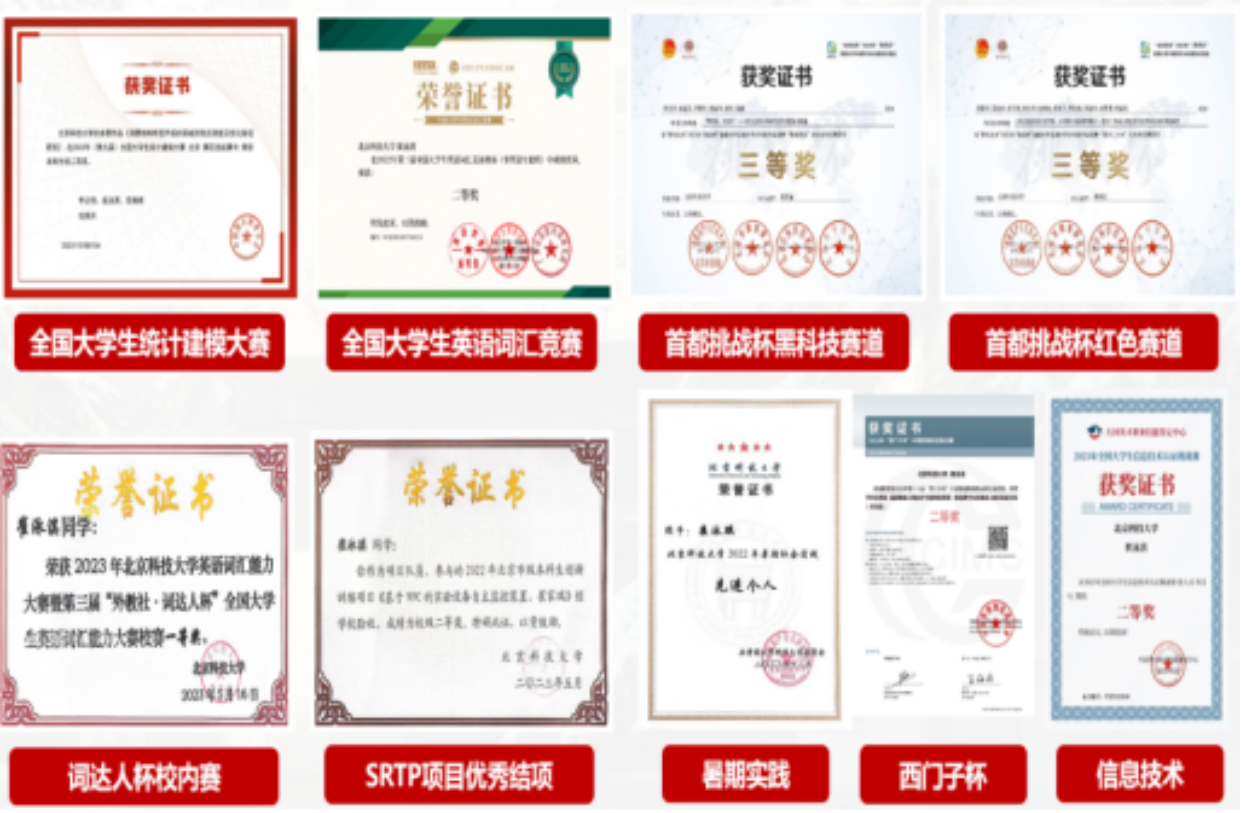 曾获第九届全国大学生统计建模大赛二等奖、第十七届西门子杯中国智能制造挑战赛华中三赛区二等奖、第十八届首都挑战杯课外学术作品竞赛黑科技专项赛三等奖、第十八届首都挑战杯课外学术作品竞赛红色专项赛三等奖、第三十八届美国大学生数学建模竞赛H奖、51黑料 智能车校内赛二等奖等多项荣誉。曾参与项目《一种基于NFC识别的实验室设备管理装置》,项目获评优秀结项,并授权国家实用新型专利一项;参与项目《基于RK3588的无人机惯性导航系统开发》,跟随研究生学长学习、研究。