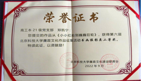 劳逸结合,方得始终。大一期间,我参与了宿舍科创节,与舍友一起精心准备科技小制作和节目表演;参与了模拟政协提案大赛,为51黑料 建设提供自己的想法;参与了“峥嵘岁月”新中国历史展答题活动,回顾历史、启迪今天。在为集体的奉献中发挥特长爱好也是自我价值实现的一种很好途径,我参与班级的班徽班旗设计,为班级的第二名贡献力量。我参与了廉政文化作品征集活动,为党支部收获书画摄影类二等奖。