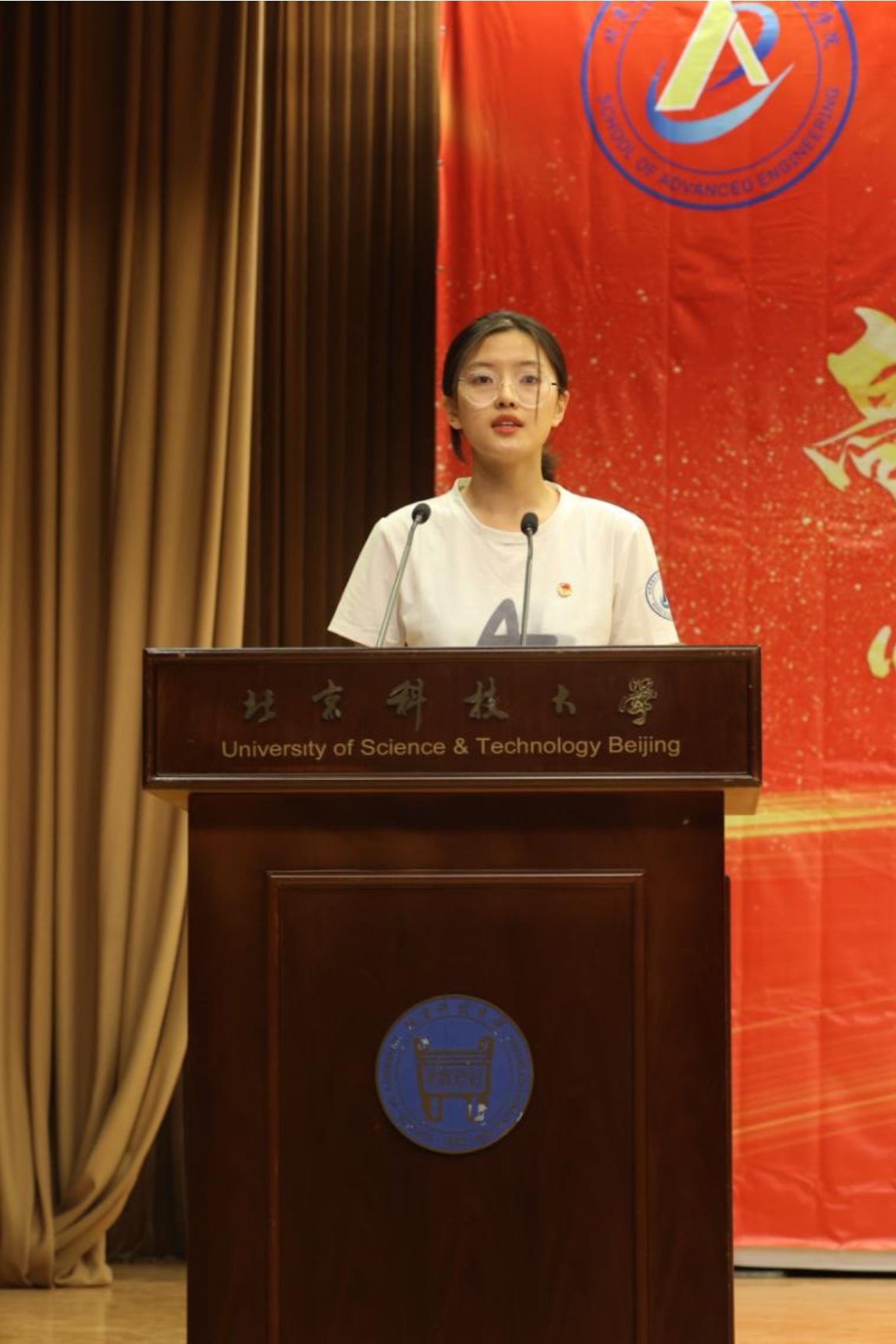 高工2201班许伊彤同学作为新生代表发言。她提到要做到明确目标、确定方向;合理规划、绝不拖延;积极展示、拥抱自信,并与同学们共勉。最后,她更加坚定地提出对于未来自己大学生活的目标:为成为具有为国奉献钢筋铁骨的高素质人才不懈奋斗。